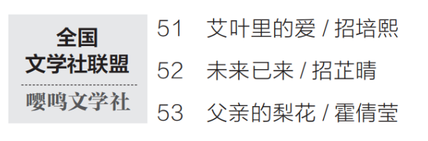 《中学生》 杂志由中国少年儿童新闻出版总社主办。该杂志编辑王子沐介绍,全国文学社联盟是由《中学生》杂志联合全国知名中学校园文学社团发起的校园写作新生力量。该联盟成立近8年来,全国范围内共有100个文学社团上榜,嘤鸣文学社是佛山第一个也是唯一一个上榜的文学社团。