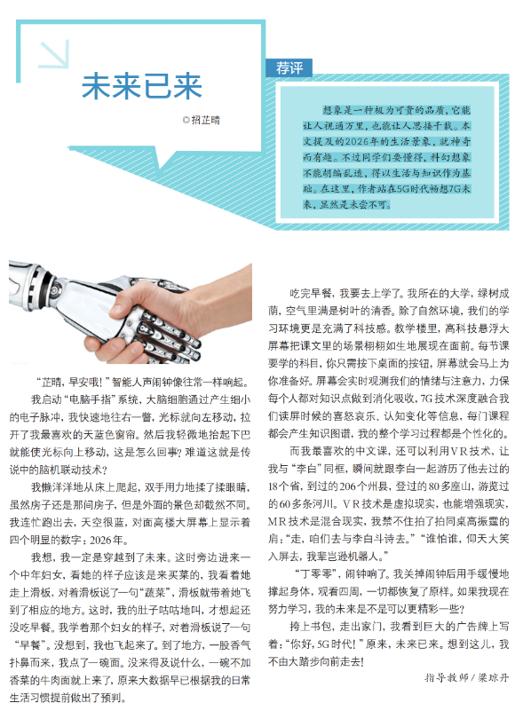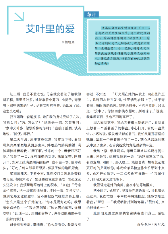发表作品较多的招芷晴、高振霆、刘雪梅等成为同学们眼中的“小诗人”“小作家”。最近连续在《中学生》和《少男少女》杂志发表作品,让招芷晴更加感受到文字带来的成功喜悦。