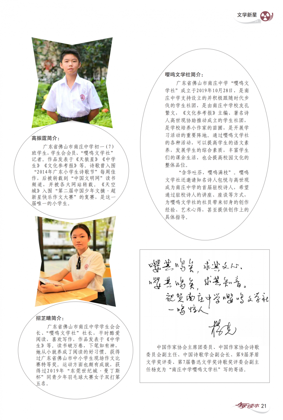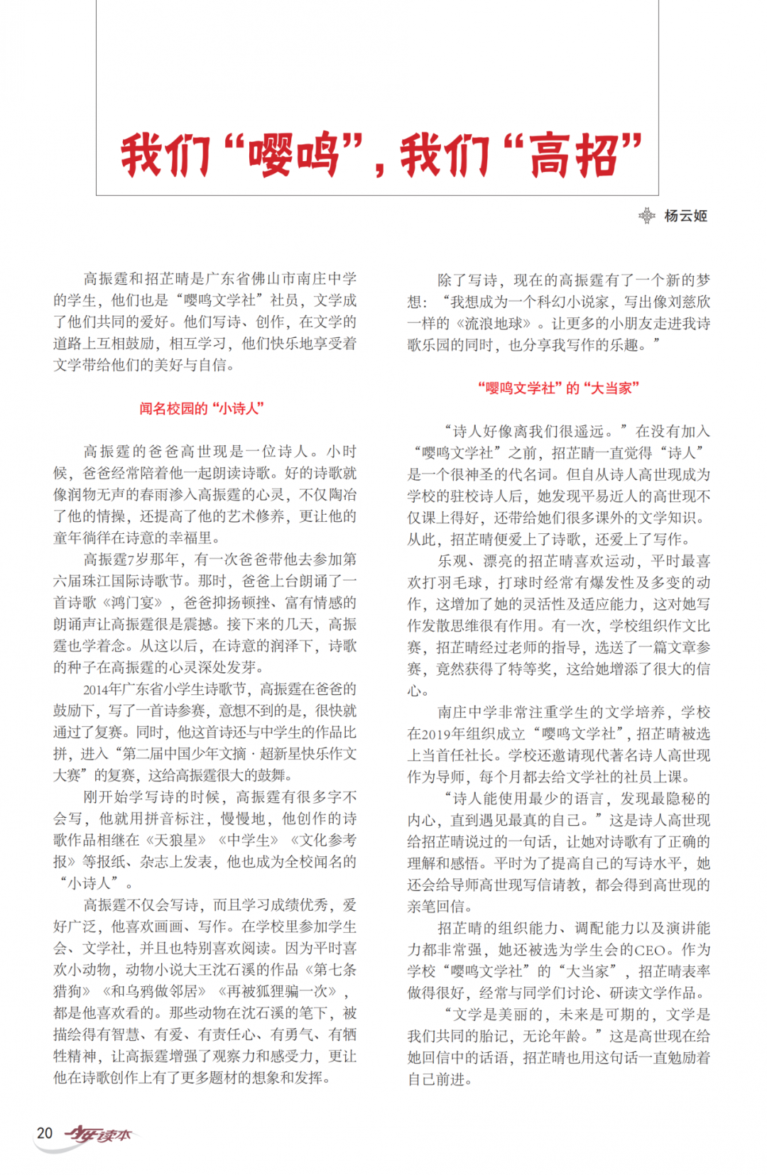 2020年5月,由广东省作家协会主办的《少男少女》杂志发表了招芷晴、高振霆的作品,并以专辑的形式推介了他们所在的南庄中学嘤鸣文学社,还对他们进行专访。