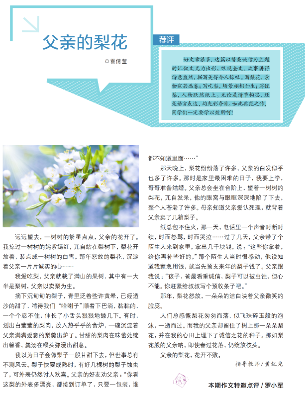 除了省级杂志的青睐,嘤鸣文学社还得到全国范围内颇具影响力的《中学生》杂志的认可。嘤鸣文学社被《中学生》杂志全国文学社联盟推选为联盟成员,并在2020年5月刊“作文状元榜”版块以4个整版专辑的形式,重点推介了嘤鸣文学社,发表了招芷晴的《未来已来》、招培熙的《艾叶里的爱》以及霍倩莹的《父亲的梨花》等嘤鸣文学社3位成员作品。